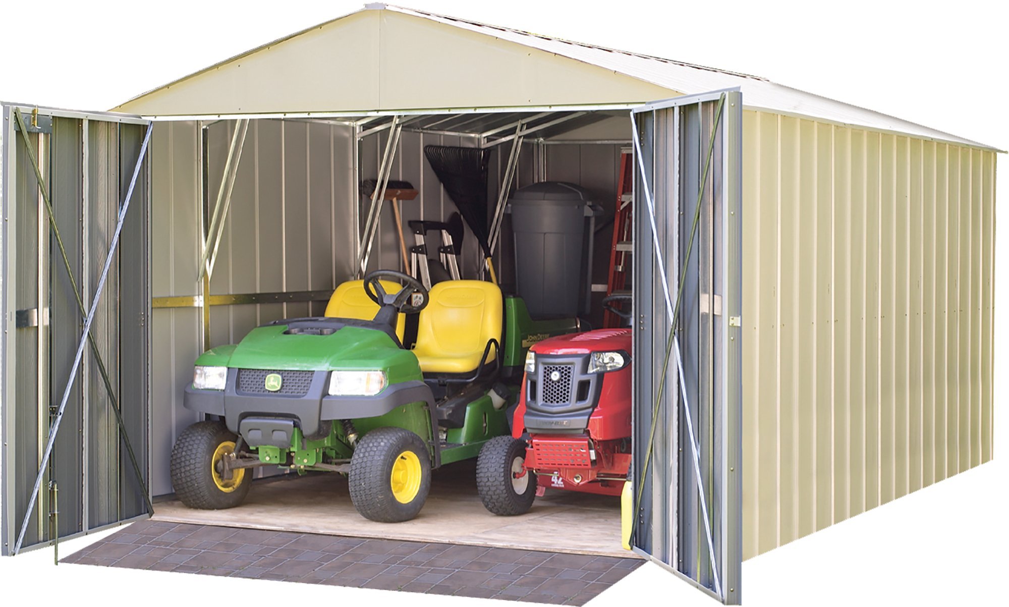 Arrow oakbrook high gable steel storage shed, eggshell/taupe, 10 x 14 ft.