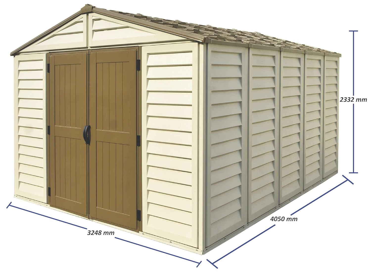 Woodbridge storage shed has you covered in any season. Wide enough to store bikes and mowers this versatile woodbridge vinyl storage shed is 10.5 feet wide and provides 563 cubic feet of storage space, with plenty of headroom. With 480 cubic feet of storage space there is no better valued vinyl storage shed in the market place today.